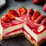 A creamy cheesecake with a vibrant strawberry swirl, perfect for summer gatherings and special occasions.